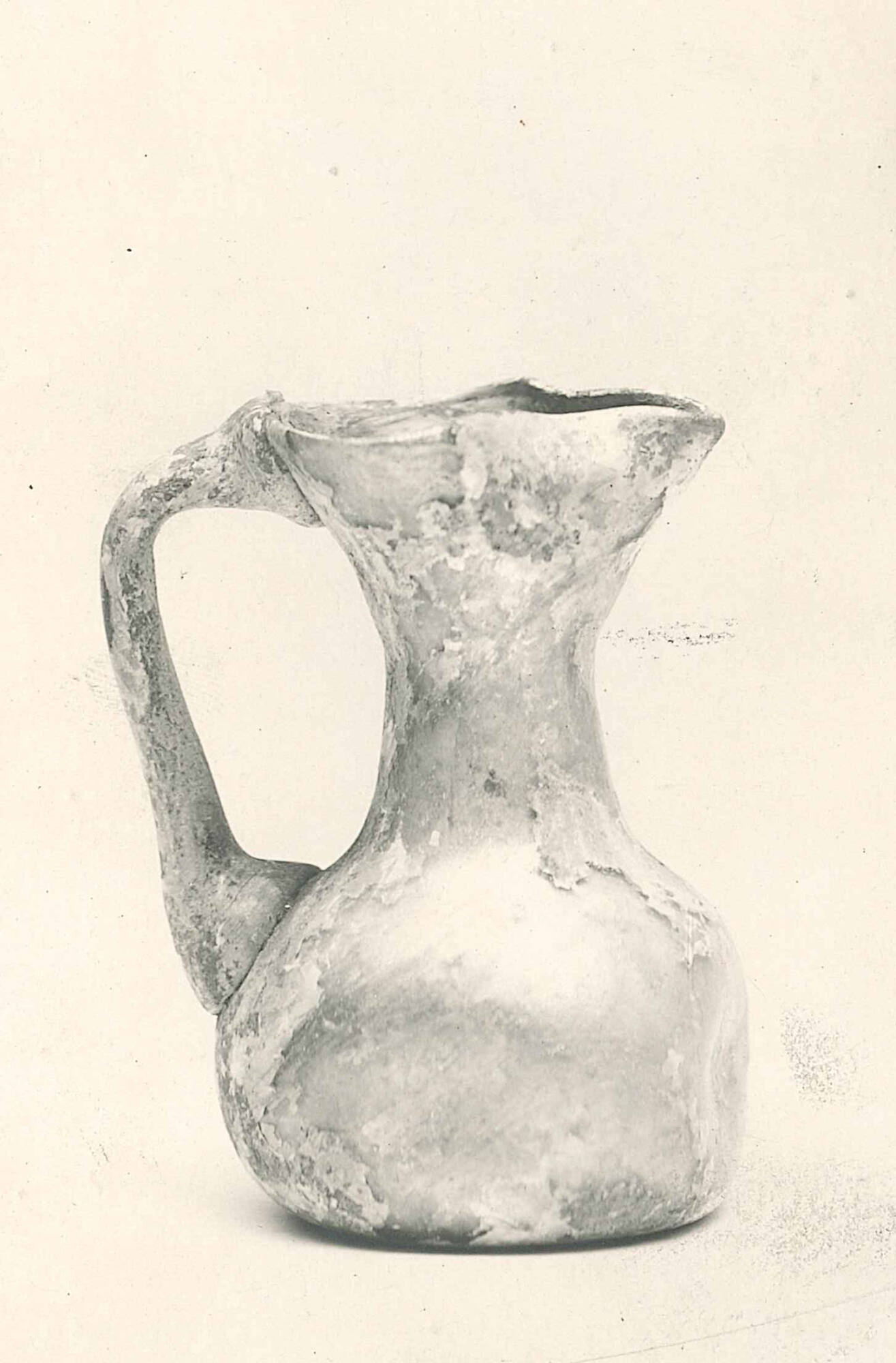 DescriptionThis squat bulbous jug (Jug Class IB1a with coil handle IA2d) is made from medium thin glass, featuring numerous pinprick and small spherical bubbles, and a few large ones in the neck and mouth. A single black speck appears in the handle, and blowing spirals are visible. The vessel is transparent natural pale green (10 G 6/2) with a similarly colored translucent handle.