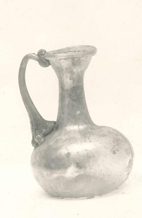 DescriptionThis squat jug (Jug Class IA1b with coil handle IA2a) is formed of transparent pale olive glass (10 Y 6/2), with a similarly colored translucent handle and coil. The thin-walled body includes two vertical cords, along with several small spherical and pinprick bubbles, black specks, and some stone. The vessel is free-blown and tooled with a pontil mark approximately 1.1 cm in diameter. The added coil is partially preserved, with excess glass at the tip of the handle folded backward between the handle and loop at the top.