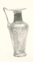 DescriptionThis inverted piriform jug (Jug Class IA2a) is made from thin, free-blown and tooled glass with very few visible bubbles. The glass is transparent and slightly streaky, colored a manganese-toned grayish red (10 R 4/2), with a translucent, similarly colored coil handle. The horizontally flaring circular mouth has a rim rounded in flame. A tapering neck transitions smoothly into a sloping shoulder. The body is inverted piriform with nearly straight sides, and the base is open and pushed-in. A straight, plain flattened coil handle is applied to the shoulder and attached to the rim. The pontil mark measures approximately 0.95 cm in diameter.