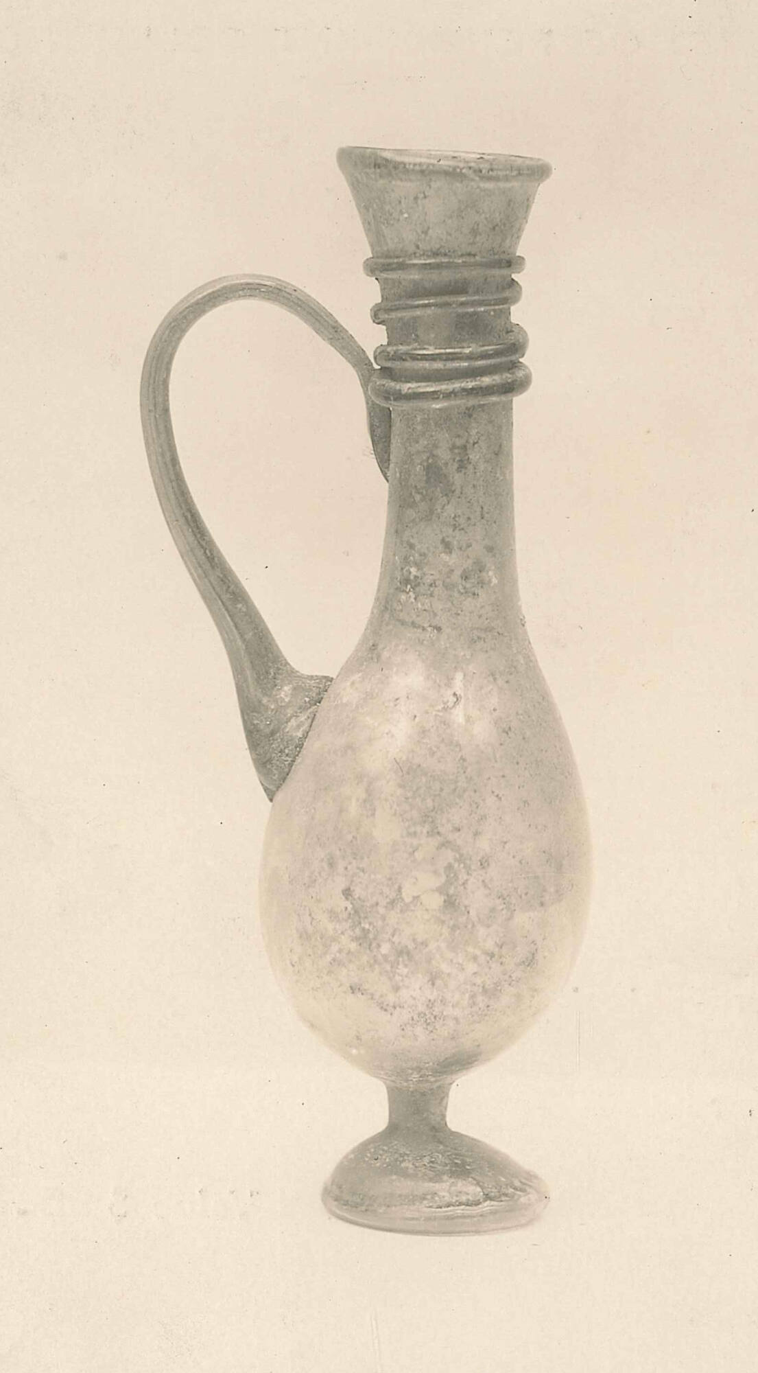 DescriptionThis jug is made of thin glass in a transparent natural yellowish-gray hue (near 5 Y 7/2, but more pink). The handle and added thread are translucent pale olive (between 10 Y 6/2 and 10 Y 5/4). The body contains some vertically elongated bubbles, and black specks are visible in the coil. The vessel was formed by free-blowing and tooling. A pontil mark about 0.7 cm in diameter is present off-center.