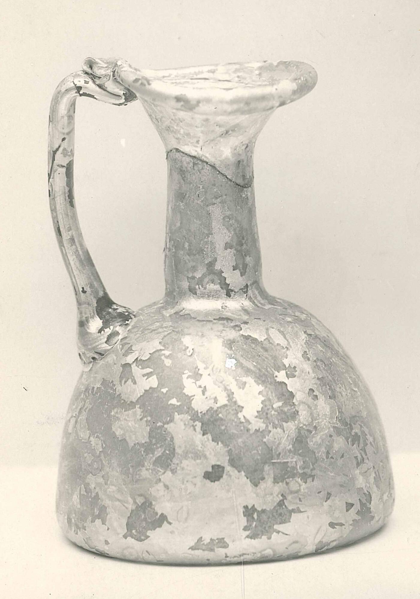 This jug is made of pale green glass. It has a rounded body, tall neck, and a handle that loops from the shoulder to the rim. The jug was shaped by hand and shows marks of how it was made, including a small scar from where it was detached from the glassblower’s rod.