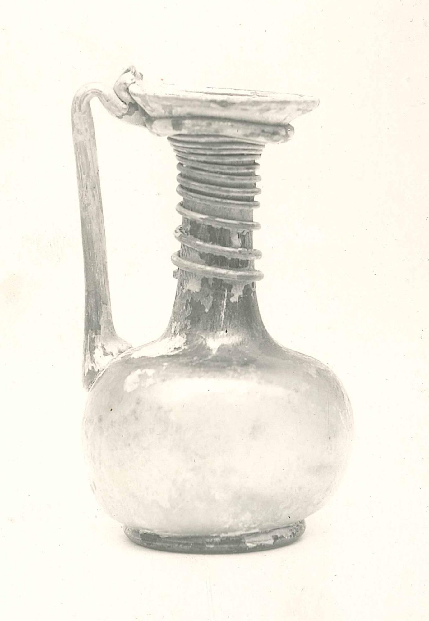 DescriptionThis small jug is made of yellow glass with green glass decorations. It has a rounded body, a tall neck, and a wide mouth. A coiled thread spirals around the neck, and a handle connects the shoulder to the rim. The base is shaped into a ring to help it stand upright.