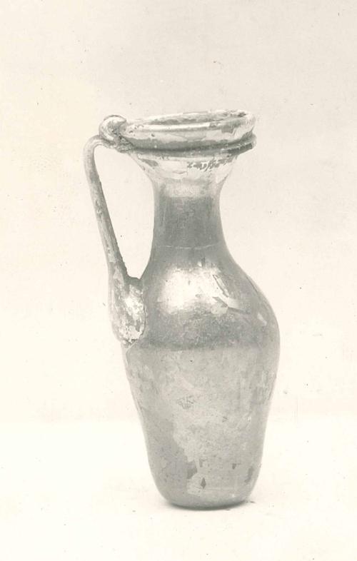 DescriptionThis jug from the fourth century CE is made of pale glass with a slight olive tint. It has a sloped shoulder and pear-shaped body, with a narrow neck and flared rim. The curved handle and coiled rim are made of blue glass. Tiny bubbles, dark specks, and sand are visible in the glass. The jug was shaped by hand, and the small circular mark on the base shows where it was separated from the glassblower’s tool.