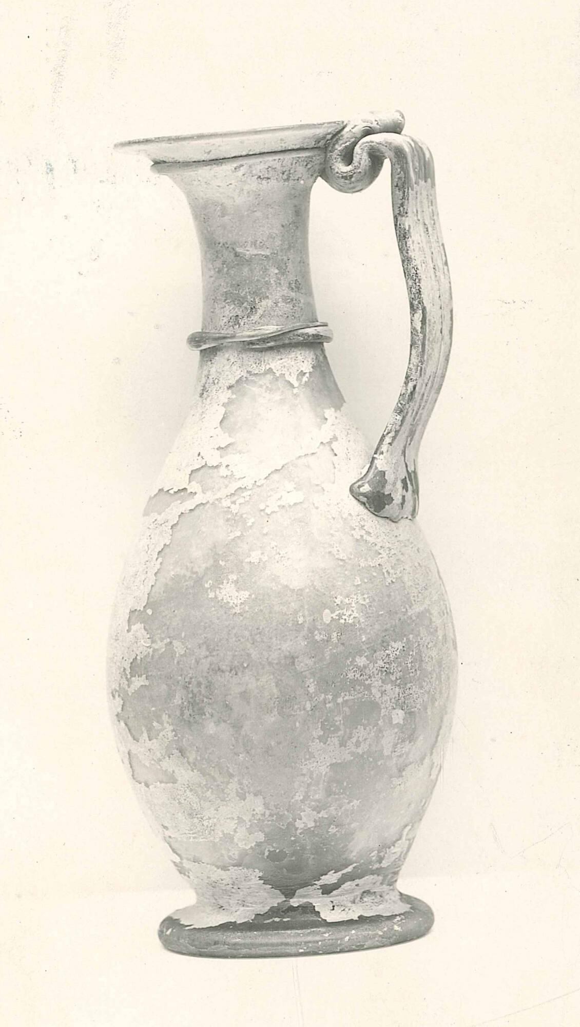 DescriptionThis glass jug from the fourth century CE has a pear-shaped body and a ribbed handle. It was shaped by hand from thick glass with a greenish tint and decorated with threads of glass around the neck and rim. The handle forms a loop where it attaches to the top. A ring at the base supports the vessel, which may have been used for serving at the table.