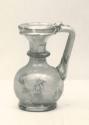 DescriptionThis glass jug from the fourth century CE was made by blowing and shaping glass by hand. It has a round, bulbous body and a narrow neck. A coil of glass decorates the neck, and the handle was added separately and shaped to include a small thumbrest at the top. The surface shows faint indentations and black specks, signs of the original crafting process.