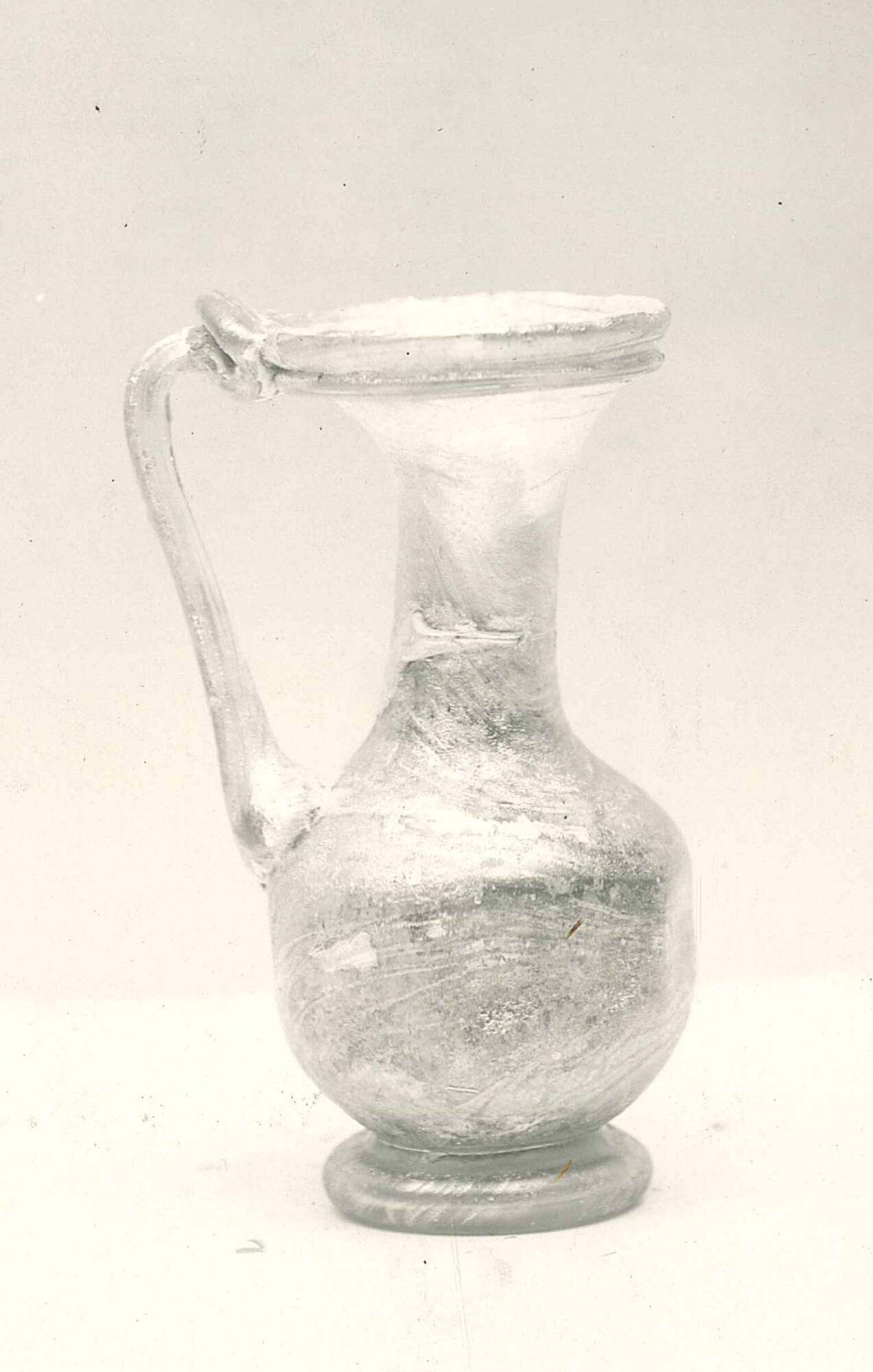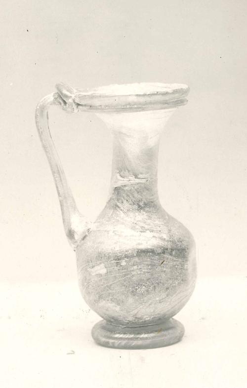 DescriptionThis glass jug from the fourth-century CE was made by shaping molten glass by hand. Its rounded body rests on a ringed base, and a single handle connects the rim and shoulder. The glassworker added a thumbrest at the top of the handle for extra grip. Decorative coils and soft circular indentations enhance the surface.