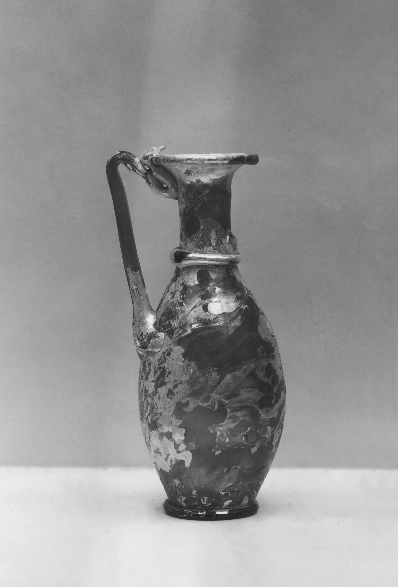 DescriptionThis jug from the fourth century CE was made from yellow-tinted glass using free-blown techniques. It has an oval body, sloping shoulder, and a folded rim. The green handle was added separately and curved to form a loop near the rim. A decorative thread was wrapped around the neck.