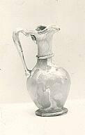 DescriptionThis jug is made of medium-thin glass in a transparent natural pale green hue (5 G 7/2), with a translucent similarly colored handle that appears slightly yellowish. Small pinprick and spherical bubbles are visible. The vessel is free-blown with a pontil mark about 1.0 cm in diameter and added coils. Excess glass at the tip of the handle was drawn out thin and snapped off.