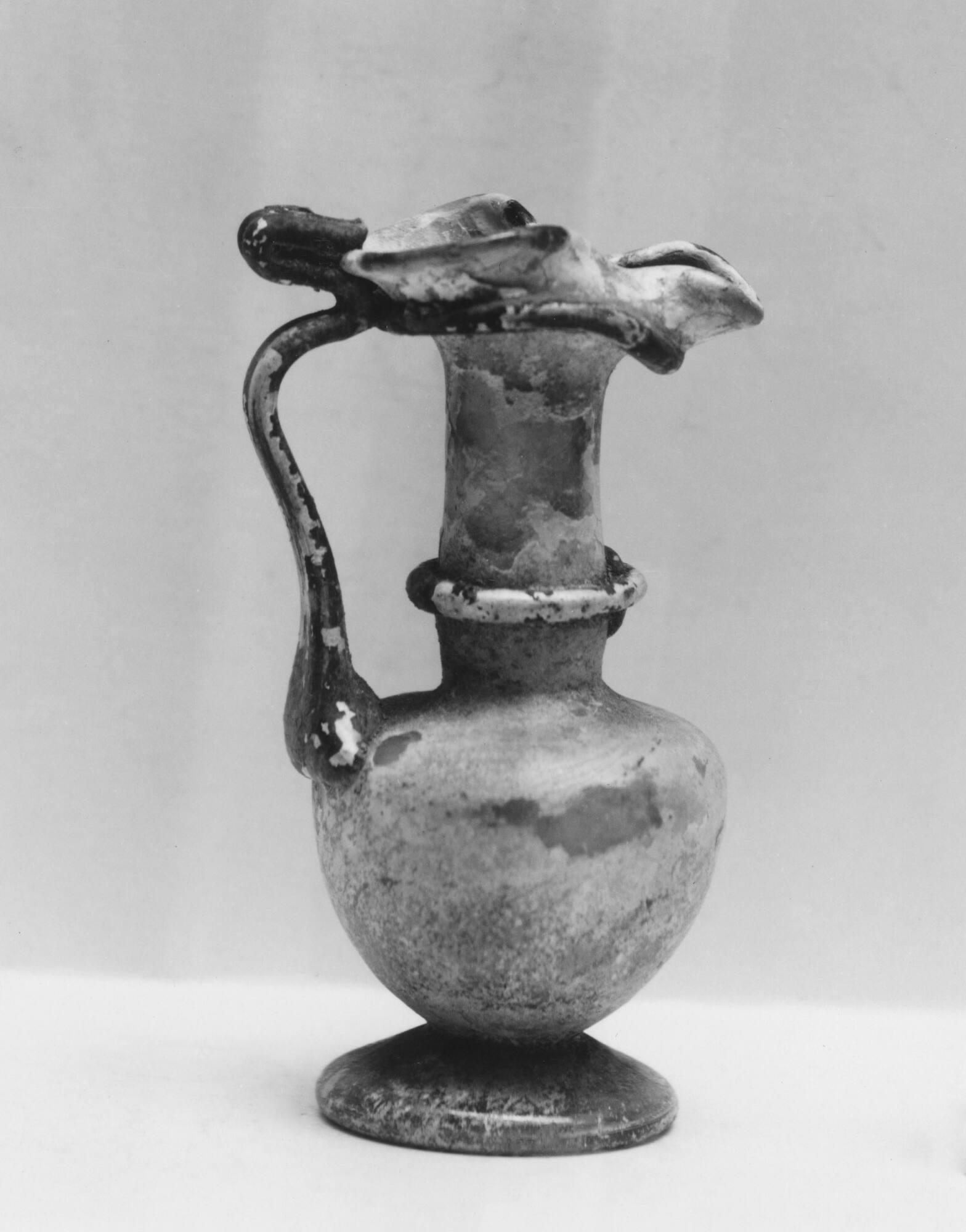 DescriptionThis jug is made of medium-thin glass in a transparent natural pale olive hue (10 Y 6/2) with translucent dark blue coils and handle. Numerous pinprick bubbles are present throughout. The vessel is free-blown with a pontil mark about 1.5 cm in diameter and added coils. Excess glass at the tip of the handle is folded outward and inward to form a closed loop, then incompletely clipped, leaving one trail folded back on top of the handle.