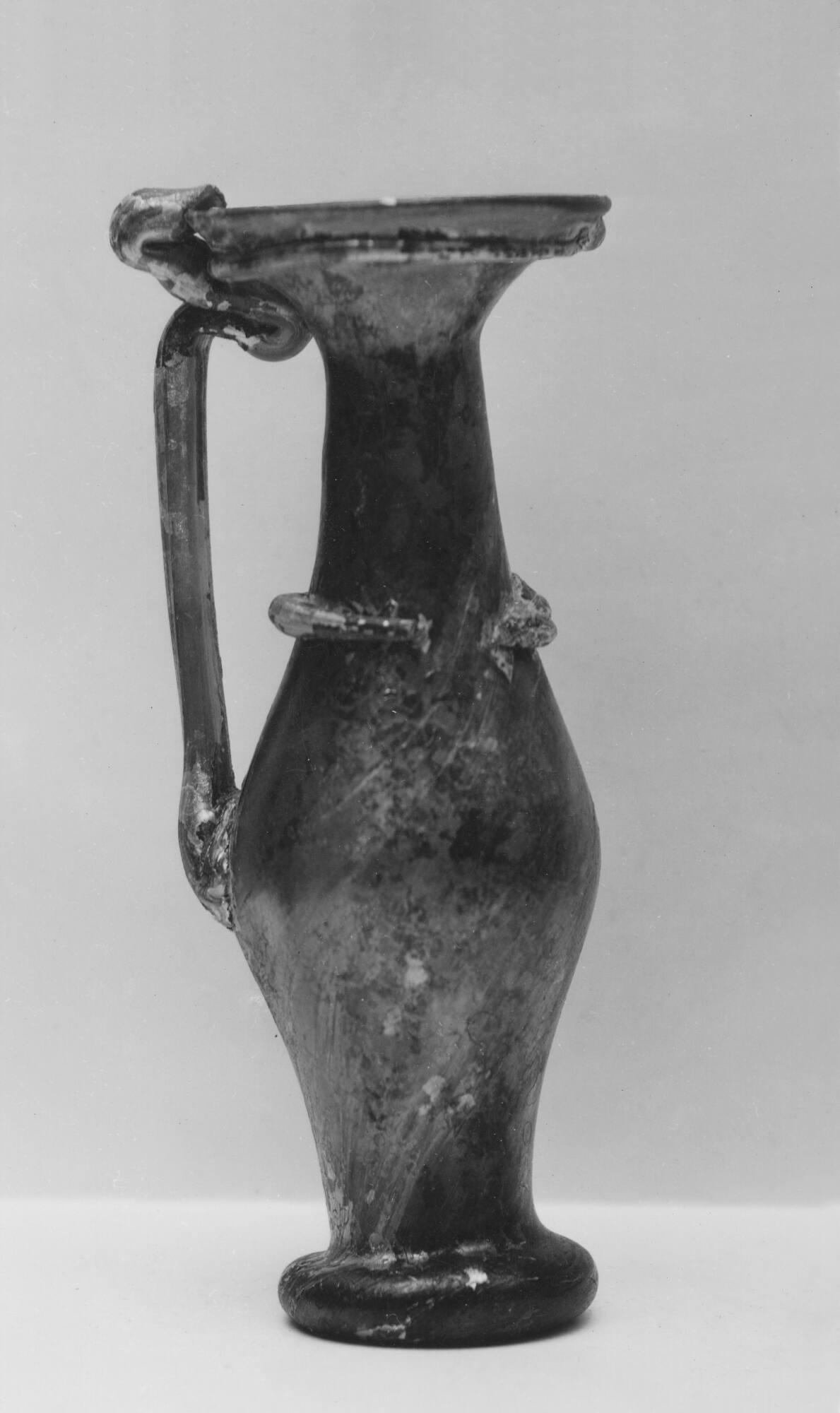 DescriptionThis reddish glass jug from the 4th century CE has a round, full body and a sharply sloped shoulder. The handle is shaped in a Z-like form with two loops and attaches from the body to the rim. The base is indented, and fine spirals and streaks can be seen in the glass. Coils decorate both the rim and neck.