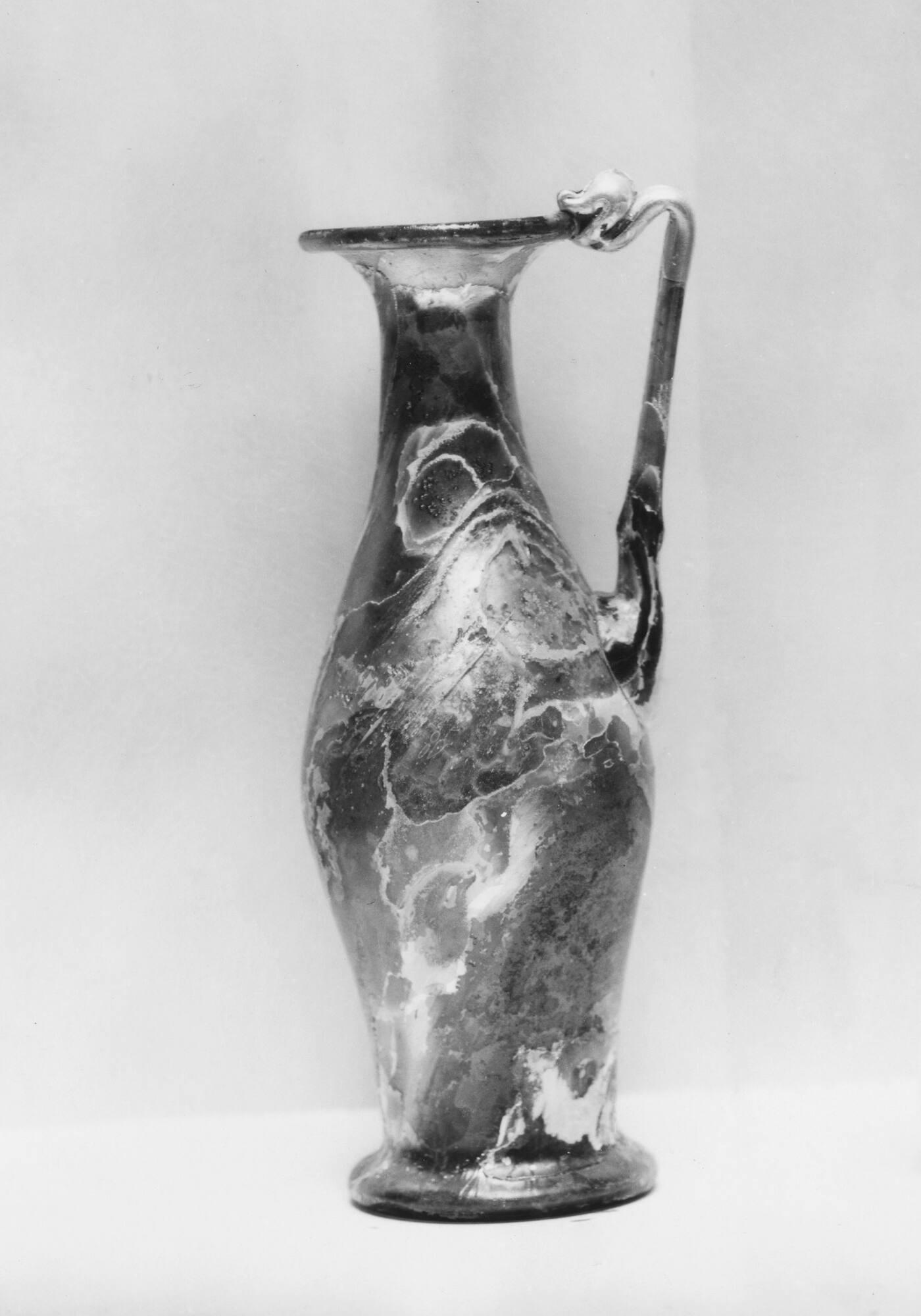 DescriptionThis bulbous jug is made of medium thin glass that appears transparent natural light olive (10 Y 5/4), with a translucent handle of similar color. A few pinprick and medium-sized bubbles, elongated vertically in the neck, are visible, along with a few small black specks and one larger speck in the handle. The jug is free-blown and tooled, with a pontil mark about 1.9 cm in diameter. Excess glass at the tip of the handle is folded back against the top of the handle at the rim. It has a flaring circular mouth with a narrow hollow rim folded outward, upward, and inward. The slightly tapering neck curves gently into the strongly sloped shoulder. The carinated bulbous body has concave lower sides and an open pushed-in base. A straight plain coil handle projects slightly above the rim, applied to the shoulder and attached to the top of the rim, where it is pressed down to form a closed figure-eight loop. This vessel is classified as Jug Class IA2b with coil handle IA1a.