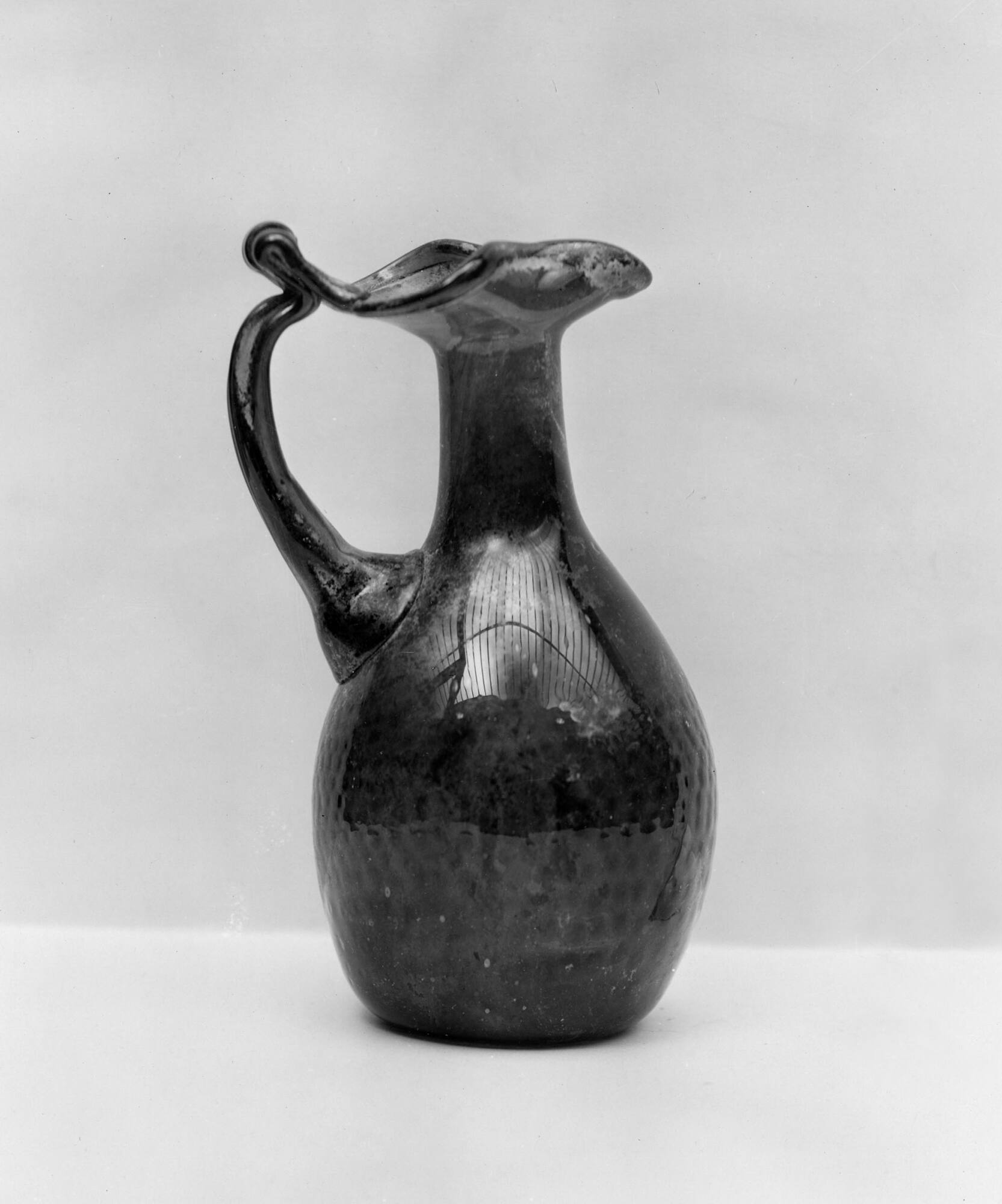 The jug has a spouted mouth with a rim folded outward, upward, and inward. The cylindrical neck transitions smoothly to the strongly sloped shoulder and the ovoid body. The concave base has a tooled kick. A curved hollow handle, nearly square in cross section, was applied to the shoulder and attached to the top of the rim, where it was folded upward and pinched to form a flat thumbrest that projects diagonally above the rim. The mouth has a trefoil-shaped tooled lip.