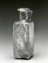 DescriptionThis bottle was formed by blowing glass into a mold to create its square shape and decorative base. The bottle has a tall neck with a wide folded rim, and a flat handle connects the neck to the shoulder. Raised circular designs are visible on the underside. Weathering on the surface has obscured the original color of the pale green glass.