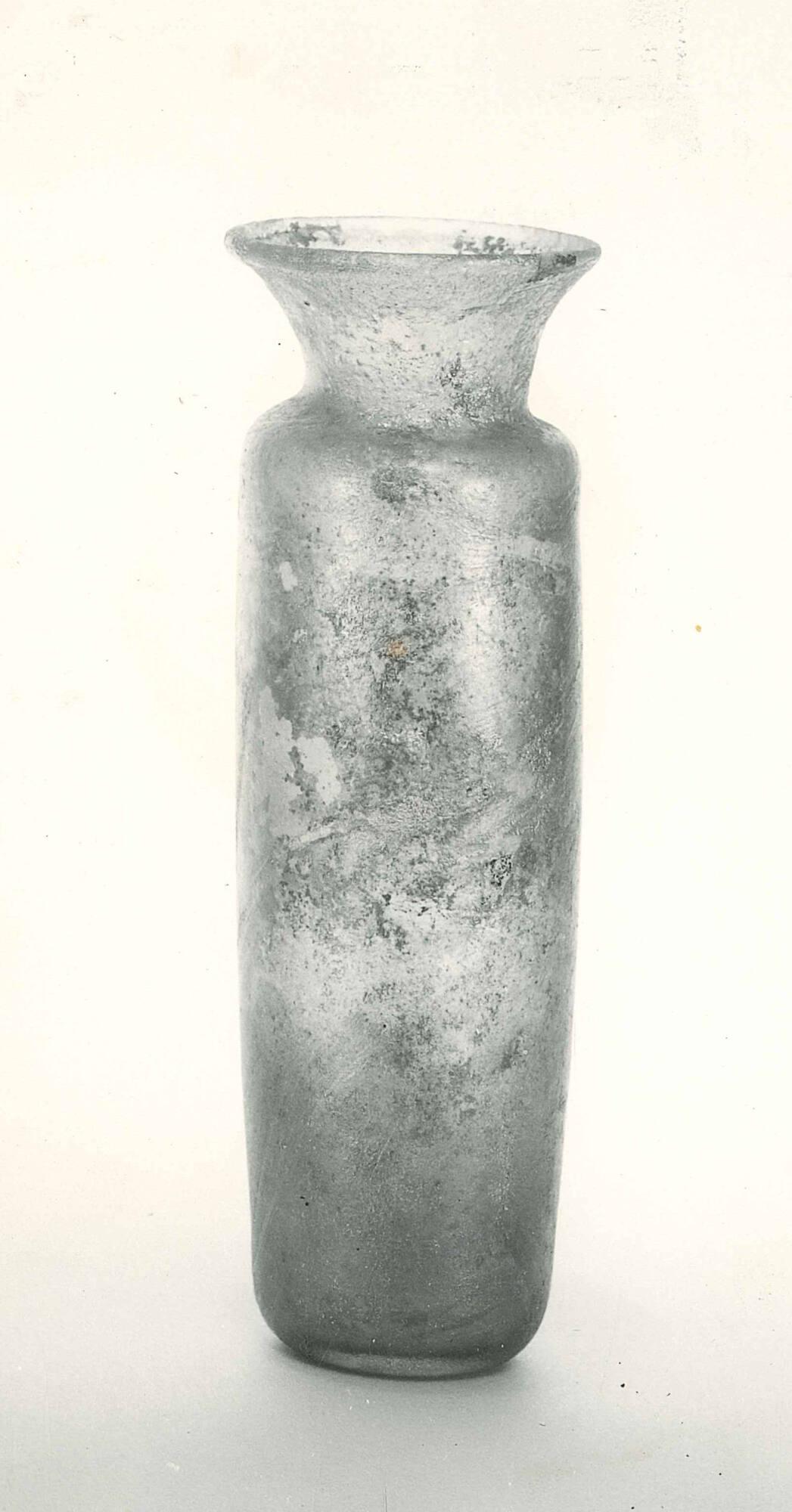 DescriptionThis bottle was made in the 3rd–4th century CE. It has a tall, slightly bulging cylindrical body and a flaring mouth. The surface shows small bubbles, and the base is flat with a small scar.