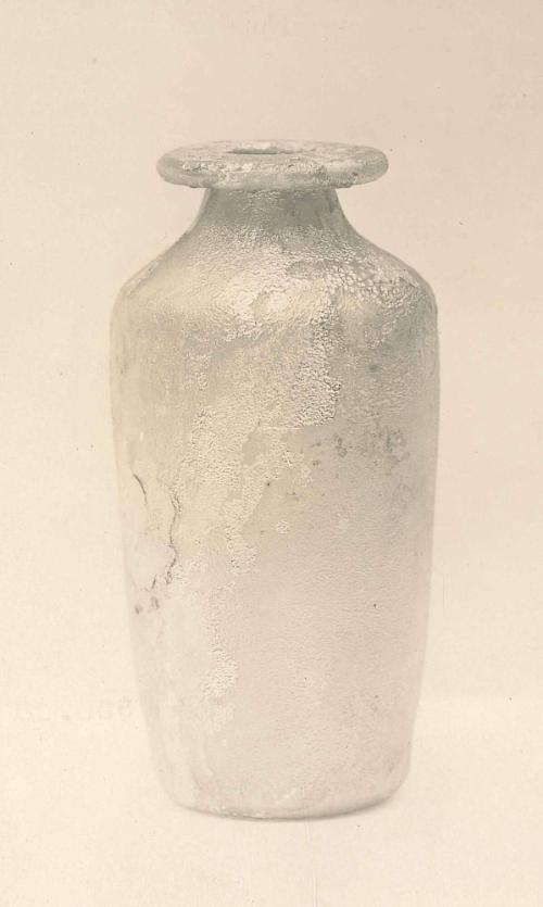 DescriptionThis pale green glass bottle was made in the 3rd–4th century CE. It has a wide flat rim, a short conical neck, and a cylindrical body with sloping shoulders. The surface shows signs of aging.