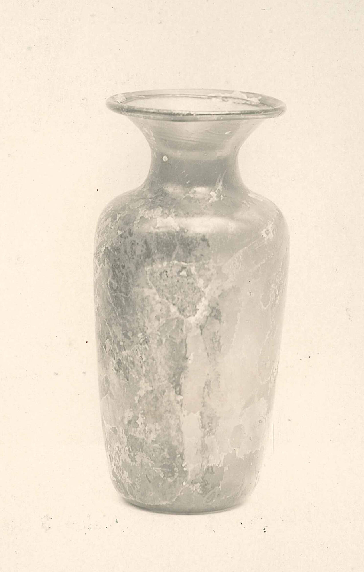 This purple-toned glass bottle was made during the 3rd–4th century CE. It has a narrow folded rim, a short neck, and a rounded body that narrows slightly toward the base.
