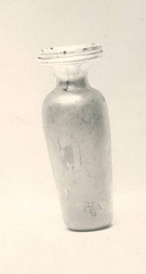 DescriptionThis bottle from the 3rd–4th century CE features a rounded collar rim and a flaring mouth. The body gently tapers toward the base, which has a shallow central indentation. It is made from green-tinted glass with small bubbles from the blowing process.