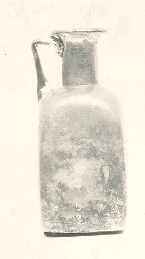 DescriptionThis bottle from the 2nd or 3rd century CE is made of light olive brown glass. It has a square shape with a sloping shoulder and a single handle. The bottle was made by blowing glass into a mold and then shaping the top by hand. Each side shows faint oval designs, and the handle is attached near the rim.