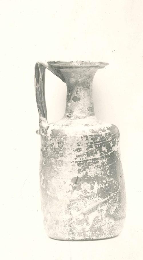 DescriptionThis glass bottle from the 4th century CE has a tall cylindrical shape and a single handle. It was made by blowing glass and shaping it with tools. The body may have been formed in a mold at first, but then reshaped to create its final form. A ring of glass was added around the rim, and the handle runs from the shoulder up to the neck.