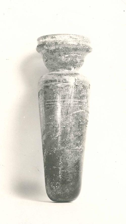 Collar rim, rounded in flame. Flaring neck with slightly convex walls and constriction at its base. Sloping shoulder with slight bulge. Cylindrical body with sides tapering to base. Small round base. Vessel does not stand.