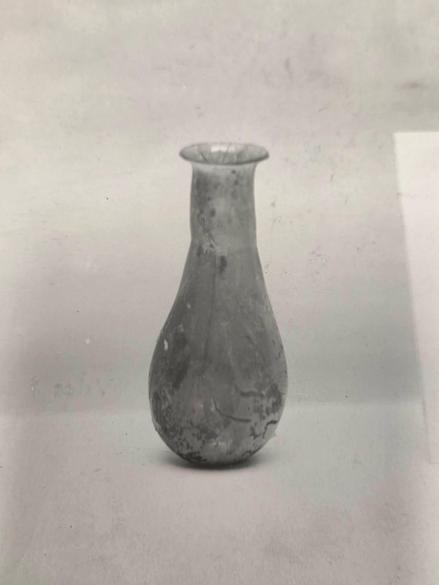 DescriptionThis small blue glass bottle was shaped by blowing and tooling. It has a flared rim, a narrow neck with a slight constriction, and a pear-shaped body with a flat base. Air bubbles are visible throughout the glass.