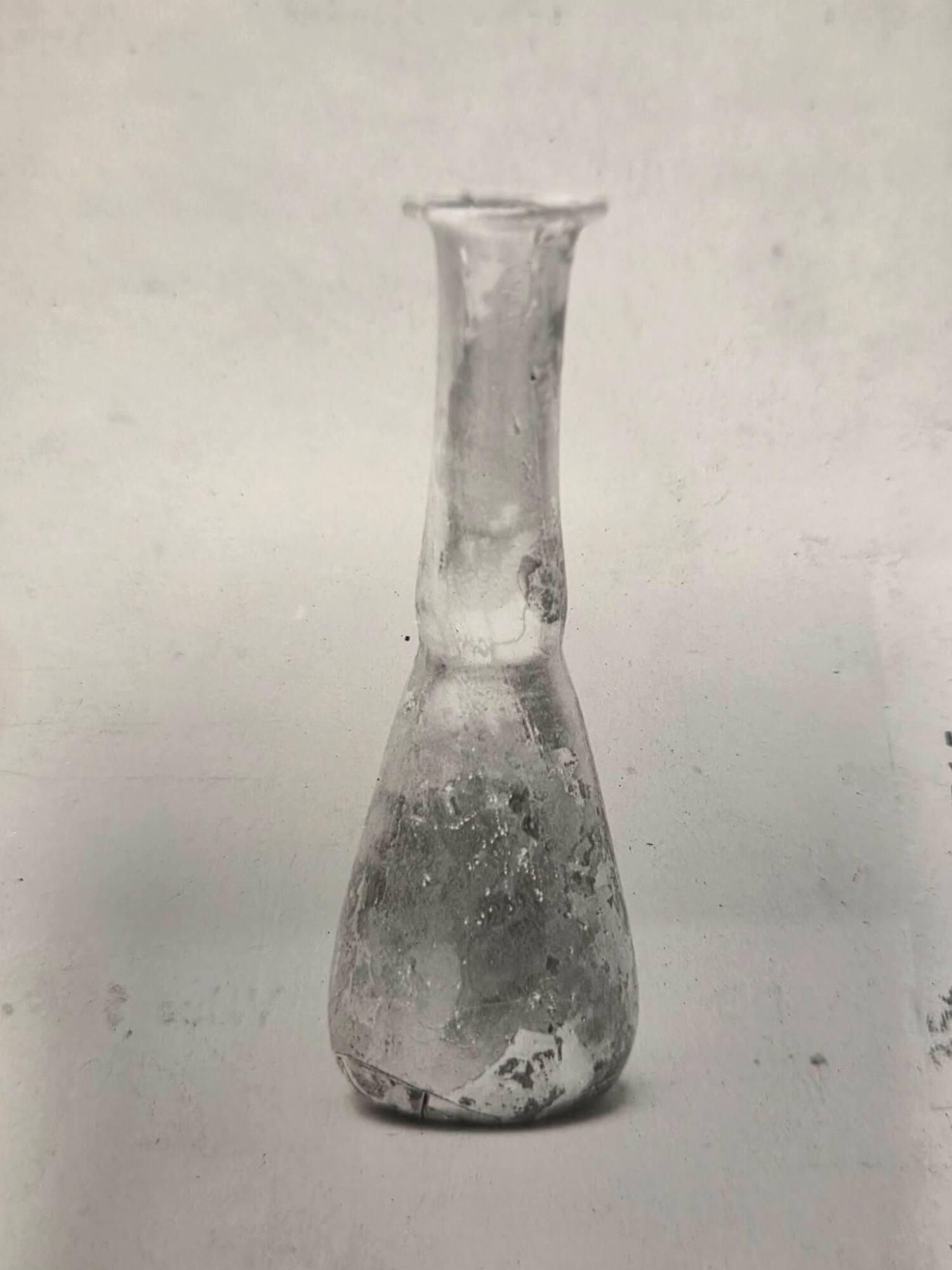DescriptionThis small glass bottle was made during the third quarter of the first century. It is known as an unguentarium, a type of vessel made by shaping hot glass by hand. The bottle has a folded rim, a long neck with a narrowed base, and a tall, triangular body. Tiny bubbles and a pale green tint reflect its handmade origin.