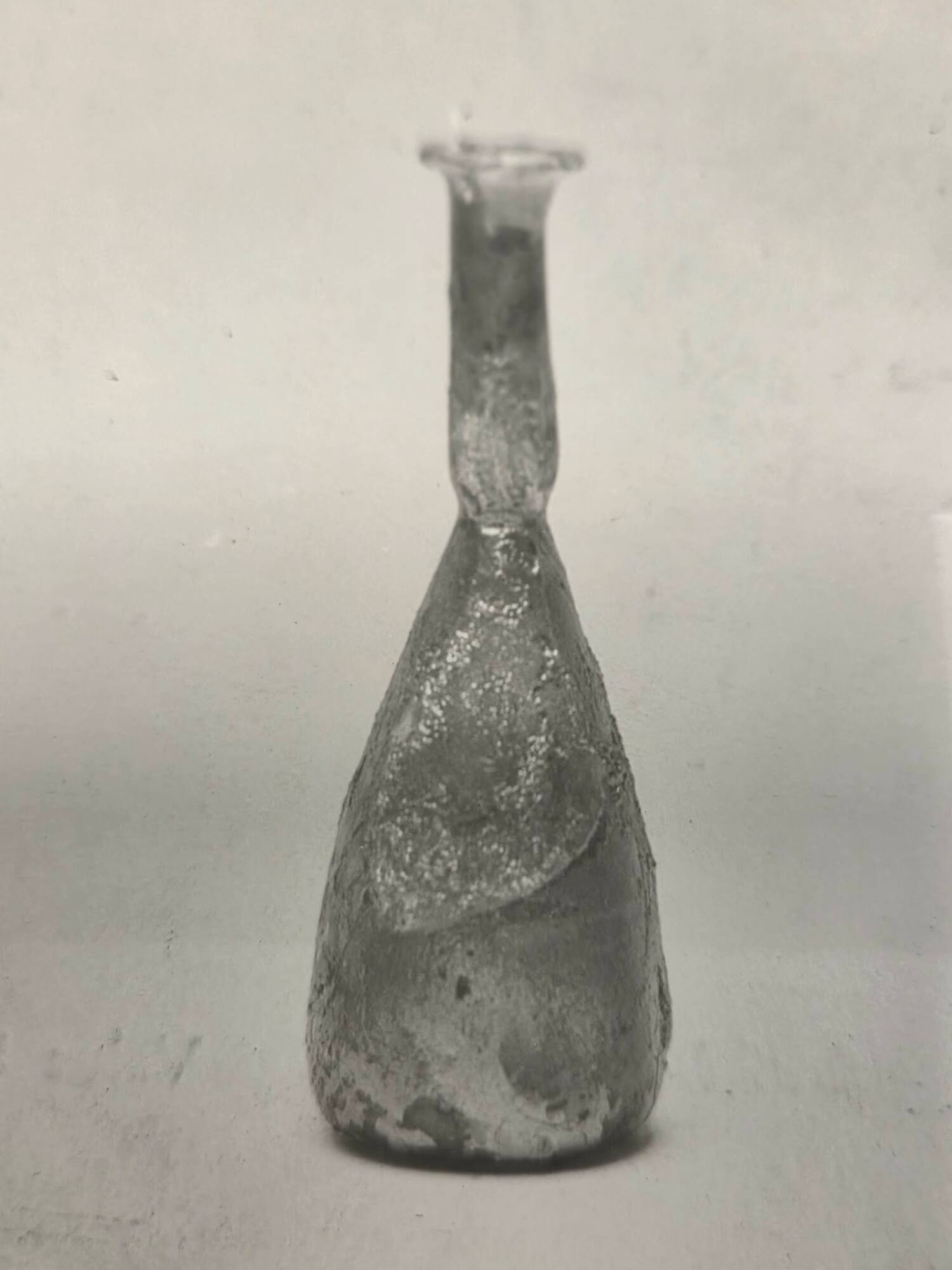 DescriptionThis glass bottle was made from thin green glass that has weathered over time. The bottle has a folded rim, a long neck with a narrowed base, and a tall, cone-shaped body. It was produced using free-blown glass techniques and has a flat base.