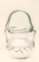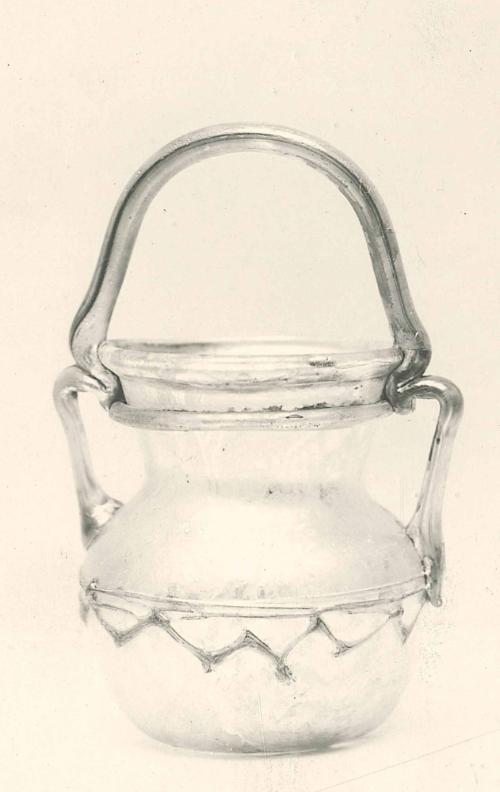 DescriptionThis green glass jar has a rounded body, two side handles, and a third handle arching over the top like a basket handle. The base is deeply concave and pushed inward. A zigzag thread with twenty-six angled sections wraps around the body’s middle, with three more loops spiraling above it. A separate coil encircles the neck just below the rim.