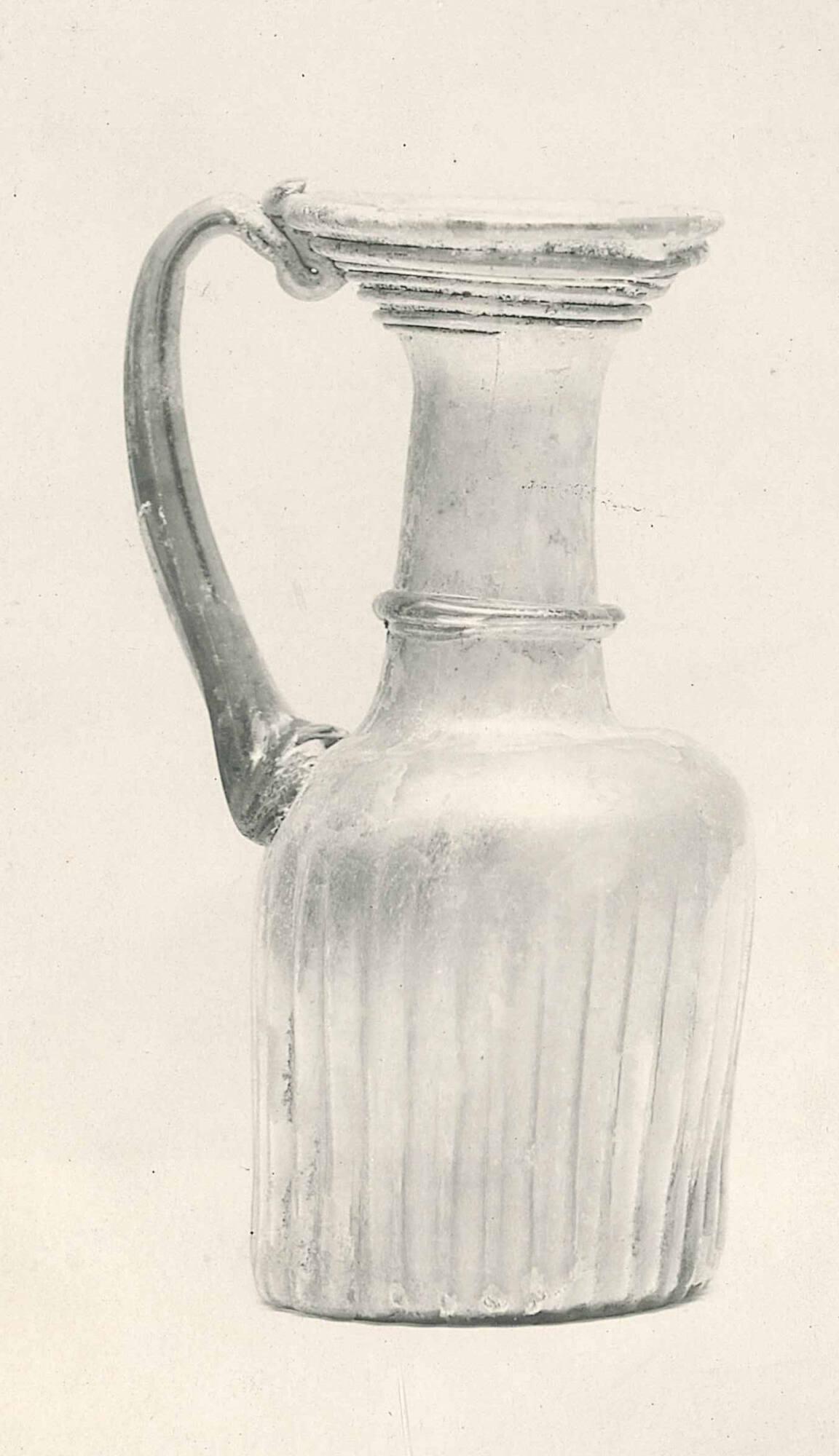 DescriptionThis glass jug was shaped in a mold and finished by hand. It has a cylindrical body with vertical ridges and a single handle that loops from the shoulder to the rim. Thin threads of glass are wrapped around the neck and the mouth. The glass is a pale green color, and the marks of the shaping process can still be seen.
