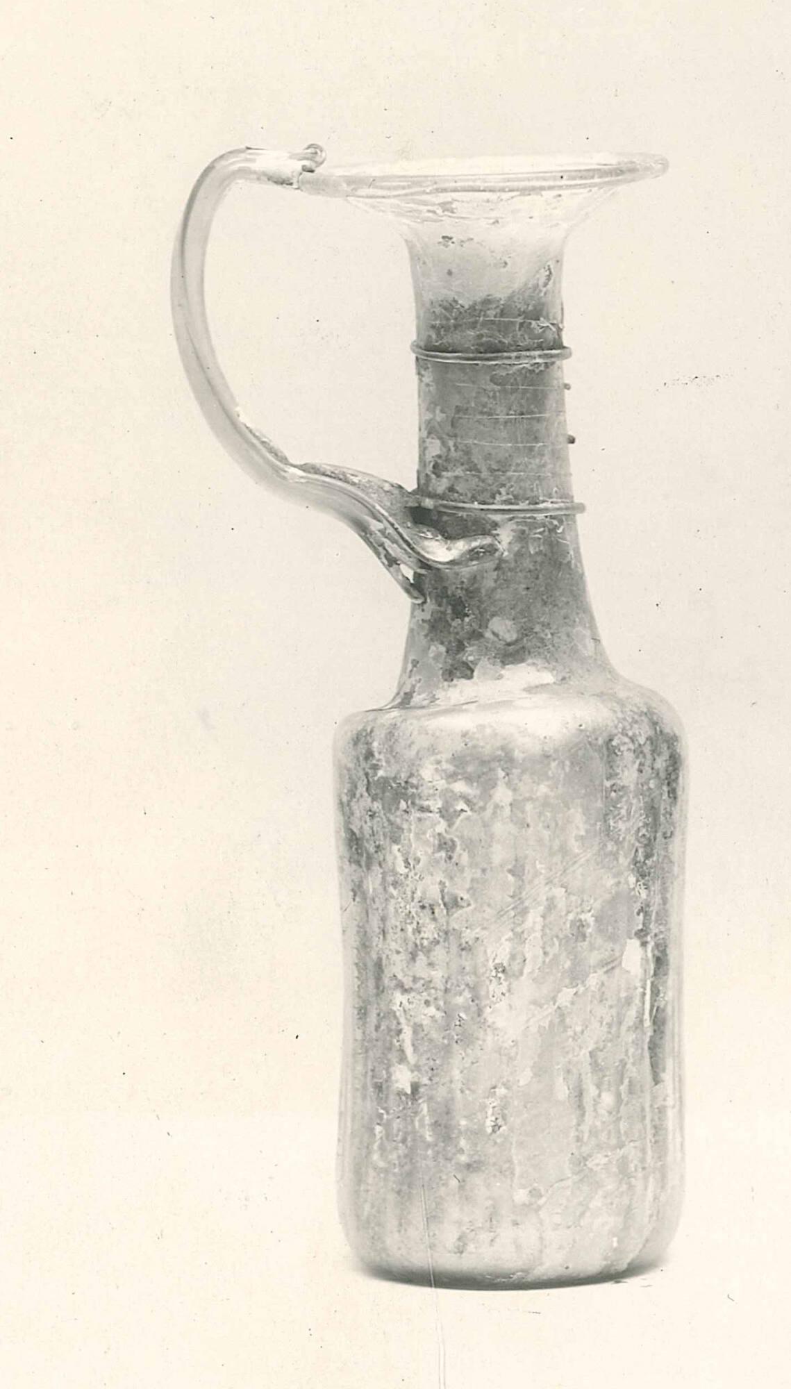 DescriptionThis glass jug was shaped in a mold and finished by hand. It has a pale green color and features a cylindrical body with vertical ridges. A thread of glass wraps around the neck, and a single handle is attached from the lower neck to the rim. The marks from blowing and shaping the glass are still visible.