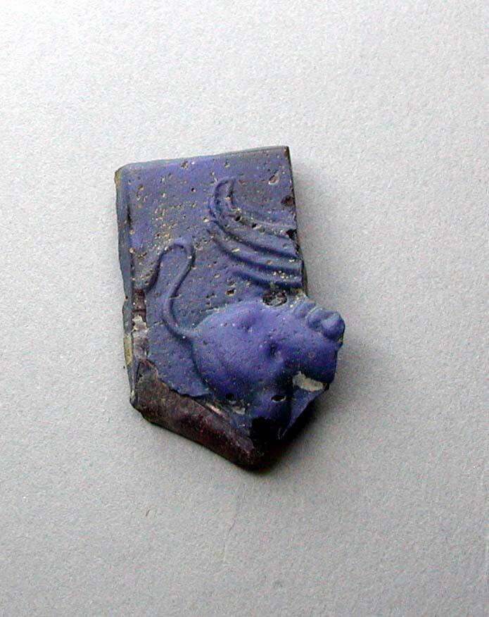 DescriptionFragment in translucent amber-brown glass coated with opaque gray-blue glass. Carved in deep relief to depict a winged griffon or lion.