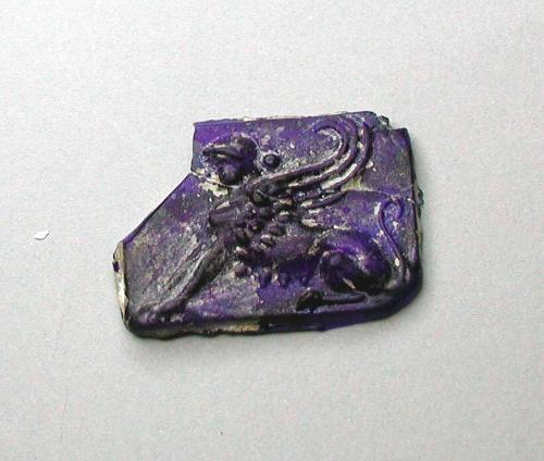 DescriptionRectangular plaque made of semi-translucent cobalt blue glass with residual opaque white glass adhering to the reverse. The front surface, deeply cut, features a molded image of a seated winged sphinx.