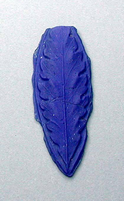 DescriptionThis opaque cobalt blue glass fragment features a molded design in the form of a curving acanthus leaf. The edges are cut to follow the leaf’s shape.