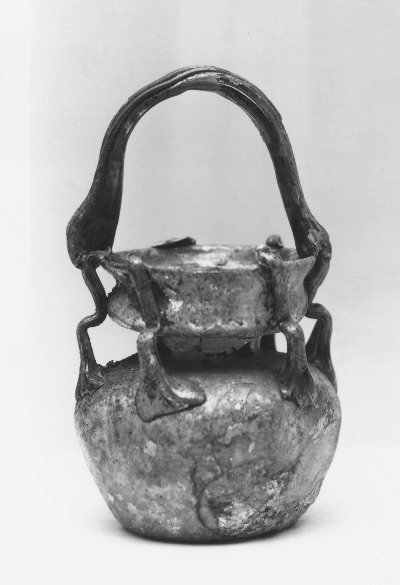 DescriptionThis bulbous jar (Jar Class I G 2 a) is free-blown and tooled from medium thin glass. The fabric cannot be determined due to weathering. It is made from transparent natural green glass, with six translucent similarly colored angular coil handles. The exact color is obscured by weathering. A round basket handle made from a heavy coil with a round cross-section is applied between two opposing handles.