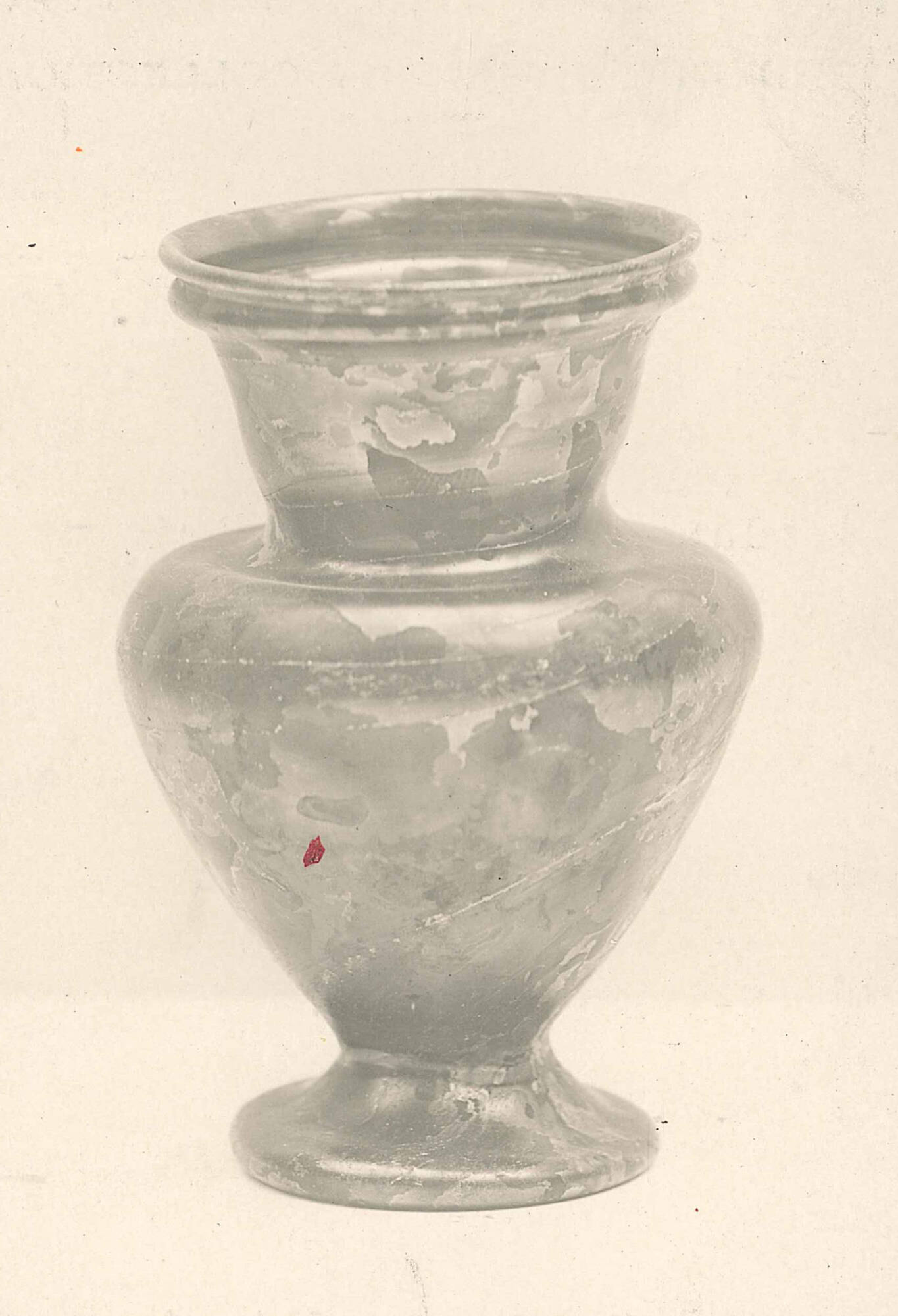 DescriptionThis dark red jar from the mid-4th to mid-5th century CE has a distinctive pointed shape and sits on a ring-shaped foot. It was made by blowing molten glass and shaping it by hand. The rim has a small rolled edge, and the neck is wide and funnel-shaped. A sharply tapered body ends in a narrow point above the base. The foot is formed from a hollow ring of glass, giving the jar both stability and elegance.