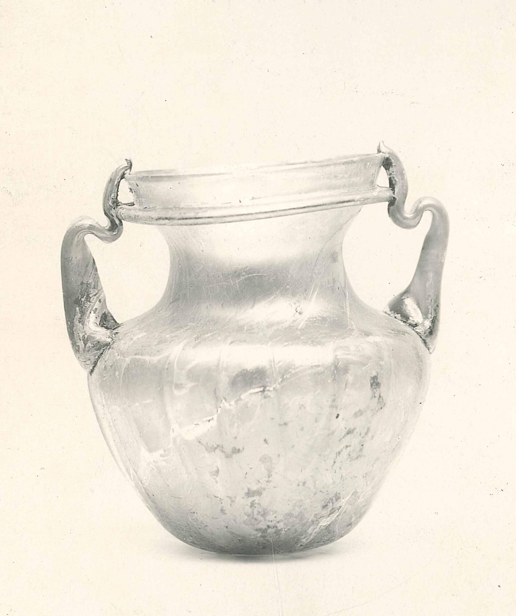 DescriptionThis ancient jar has a tall, curved neck and a rounded body. Two handles connect the rim to the shoulder. The decoration includes vertical pinched lines around the lower body, which can be felt on the inside.