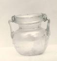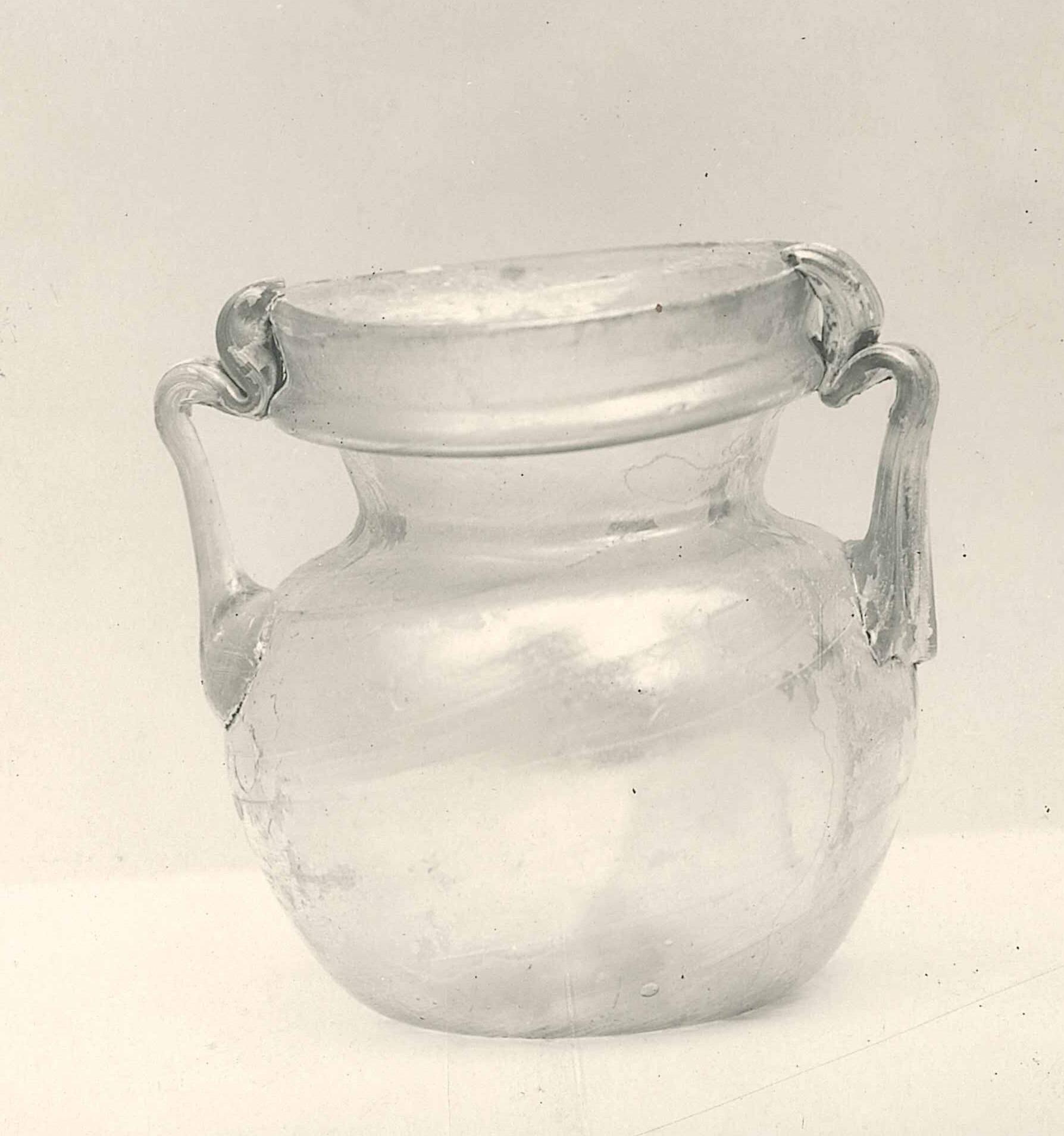 This small jar is made of light green glass with two handles that connect the shoulder to the rim. It has a short, outward-flaring neck, a rounded shoulder, and a bulbous body. The base is slightly pushed in. Small bubbles and swirls can be seen in the glass from the blowing process.