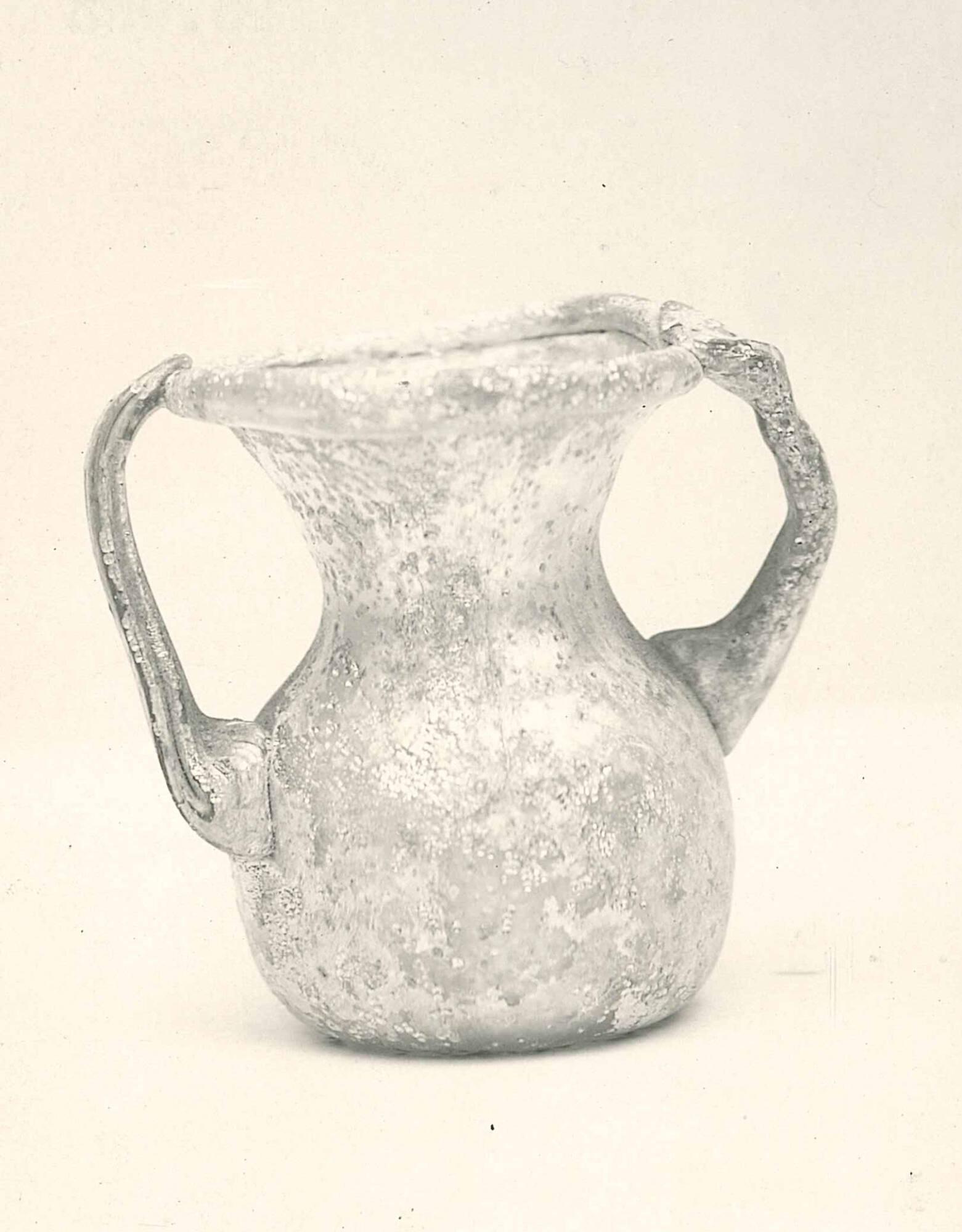 DescriptionThis small green glass jar was shaped using blowing and tooling techniques. It has a funnel-shaped neck, a sloping shoulder, and a rounded body. The rim is folded in three directions. Two handles, made from the same glass, were added from the shoulder to the rim. Signs of its production, such as the pontil and reamer marks, remain visible.