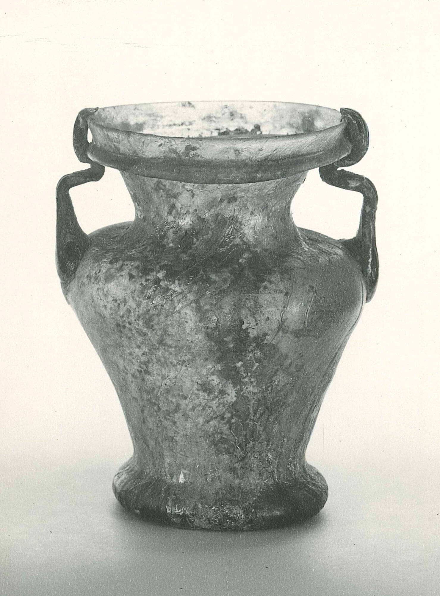 DescriptionThis clear glass jar with purple streaks was shaped using blowing and tooling techniques. Its rim is rounded and sits above a narrow raised band, which is open on one side. The neck widens into a sloped shoulder and narrows again into an inverted cone-shaped body with slightly concave walls. Two handles were added from the shoulder to the rim, where they lean slightly inward. The base features a pushed-in ring.
