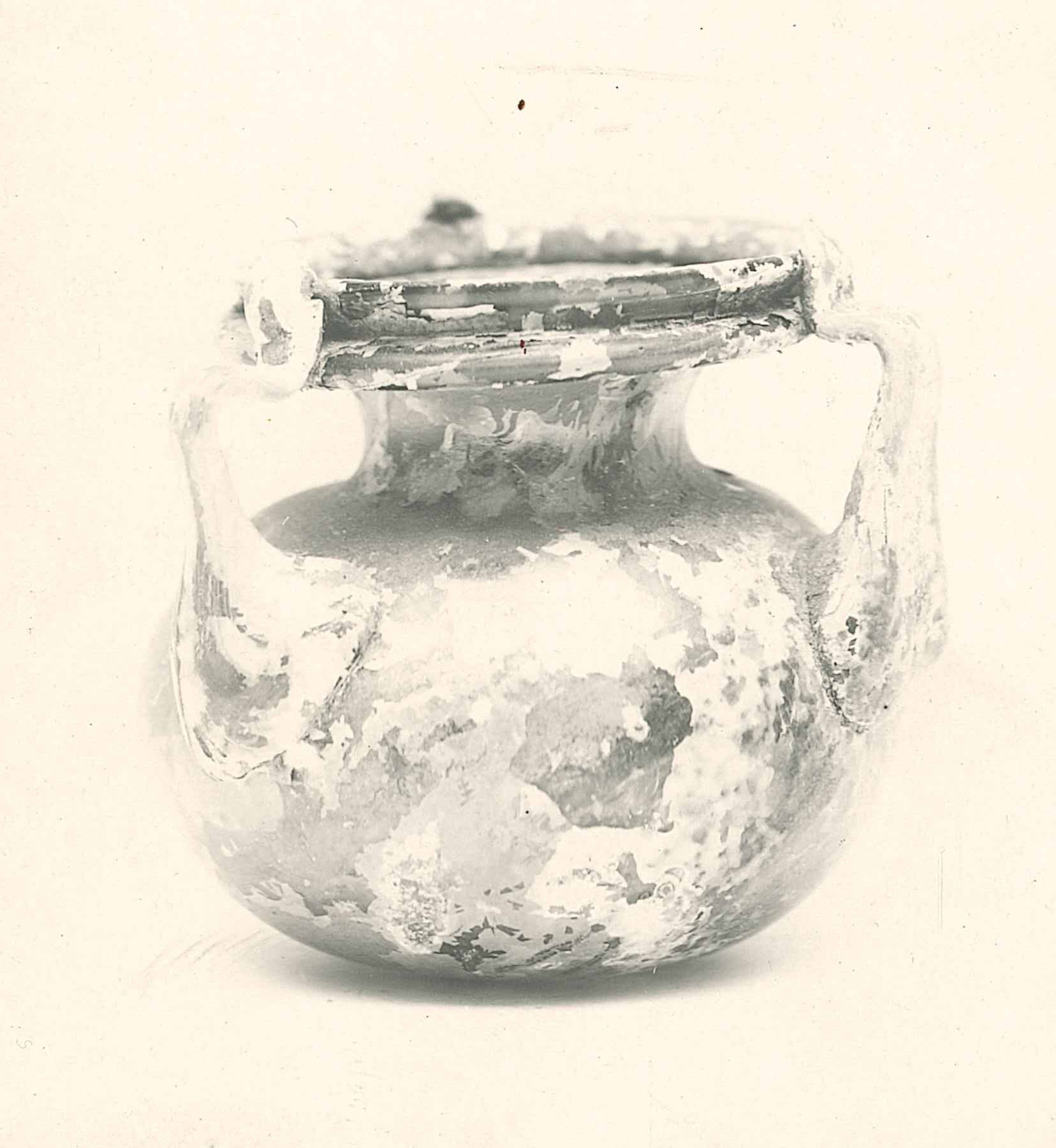 DescriptionThis red glass jar has a rounded body, a deeply concave neck, and a sloping shoulder. Its rim is rounded and has a narrow raised band below it. Three handles, made from greenish glass, are attached to the body and rise to the rim. The base is flat with a central dip. The glass contains bubbles and small particles from the manufacturing process.