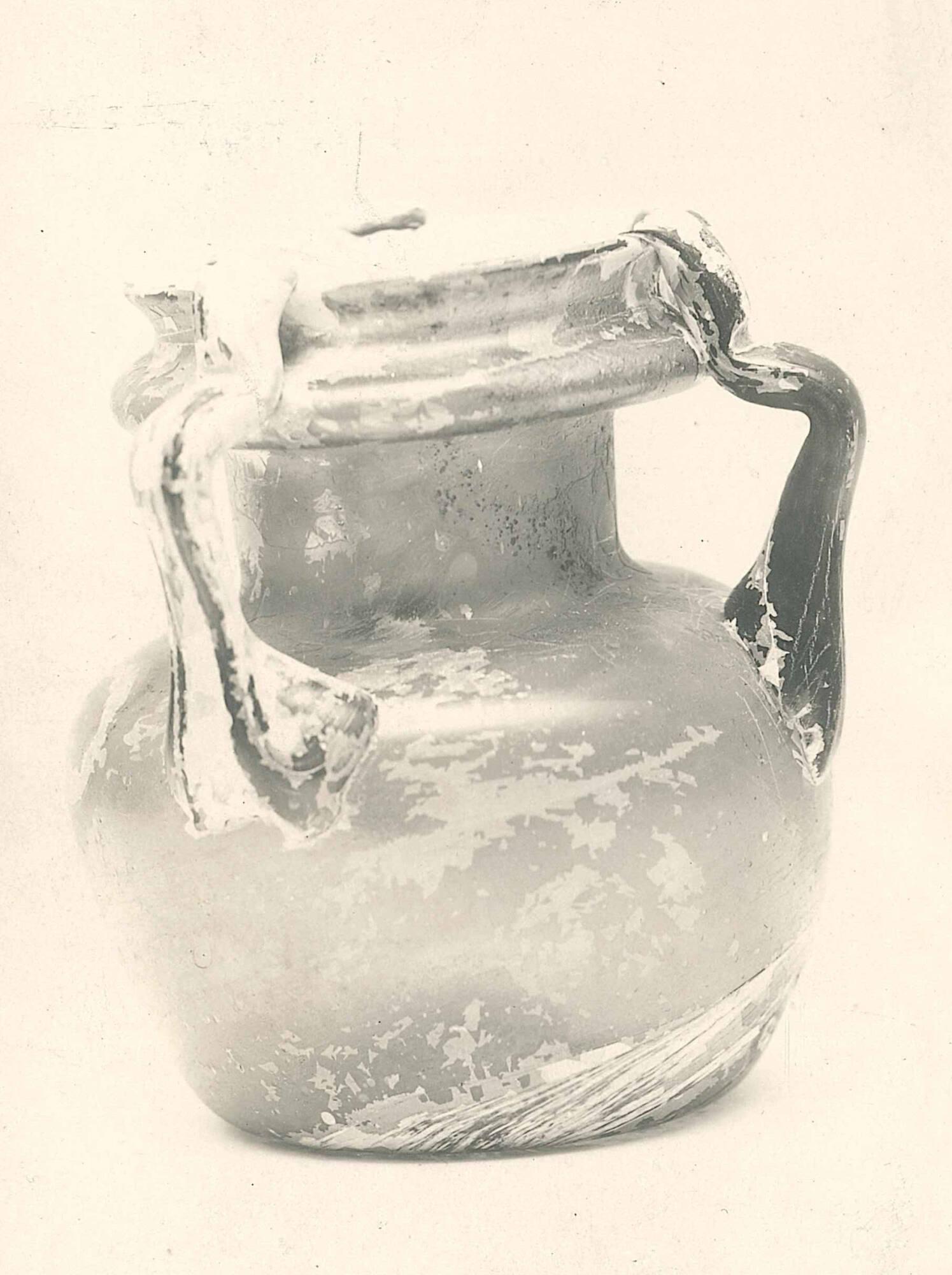 MediumGlass; free blown and tooled; handles hot-tooled on.
