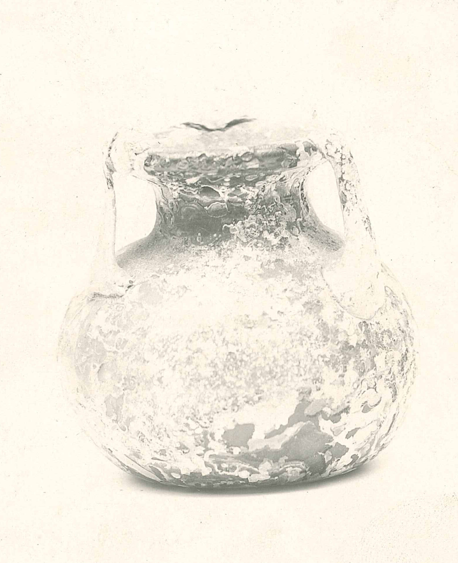 DescriptionThis yellowish glass jar has a short, rounded body and a deeply concave neck. Its rim is folded in several directions, giving it a thickened edge. Three handles rise straight from the shoulder and attach to both the side and top of the rim. The base is concave, and the glass shows small bubbles from its manufacture.