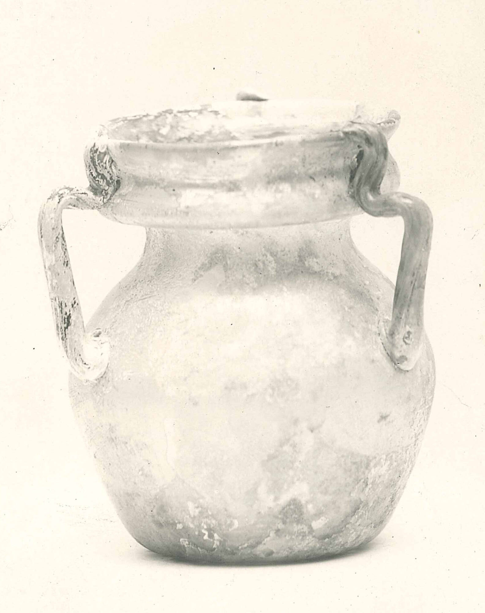 DescriptionThis pale yellow glass jar has a rounded body and three greenish handles. The rim is collar-shaped with a notch cut just below it. The neck is deeply concave, leading into a sharply sloped shoulder and an elongated bulbous body. The base is concave. Each handle loops from the shoulder to the rim, folding back slightly at the top.
