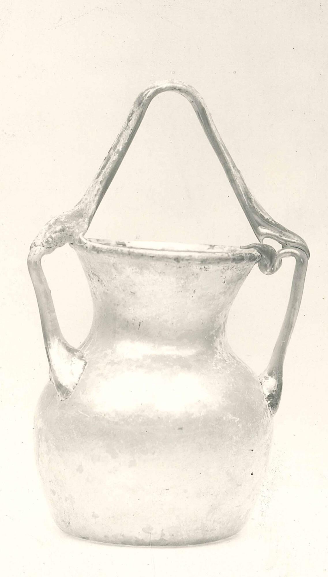 DescriptionThis pale green glass jar has a rounded body and three handles: two at the sides and one arching over the top like a basket handle. The neck flares outward above a sloped shoulder. The rim is folded in multiple directions, and one side handle curves up and over the rim. The base is concave.