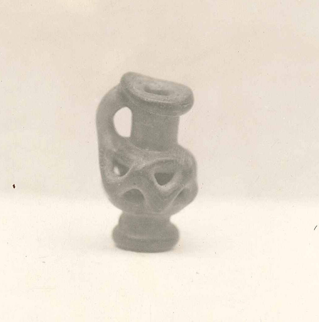 DescriptionTranslucent dark glass. Globular body with openwork decoration of applied glass threads. One handle.