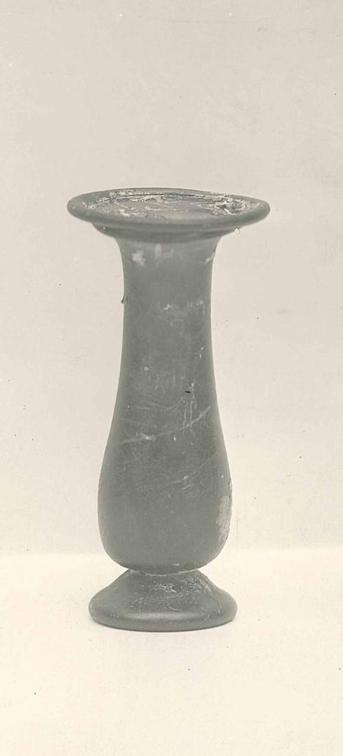 DescriptionThis vessel, classified as Tubular Jar IA1b, is made of thin, free-blown glass with small oval and vertically elongated bubbles and visible blowing spirals. The glass is transparent to translucent manganese-colored grayish red (not in the rock color chart) with similarly colored coil handles, now missing. A pontil mark approximately 1.0 cm in diameter is visible. The jar has a flaring rim folded outward, upward, and inward, and a slender tubular body that bulges from a constriction above the base. The high pushed-in base features a central kick forming a hollow base ring.