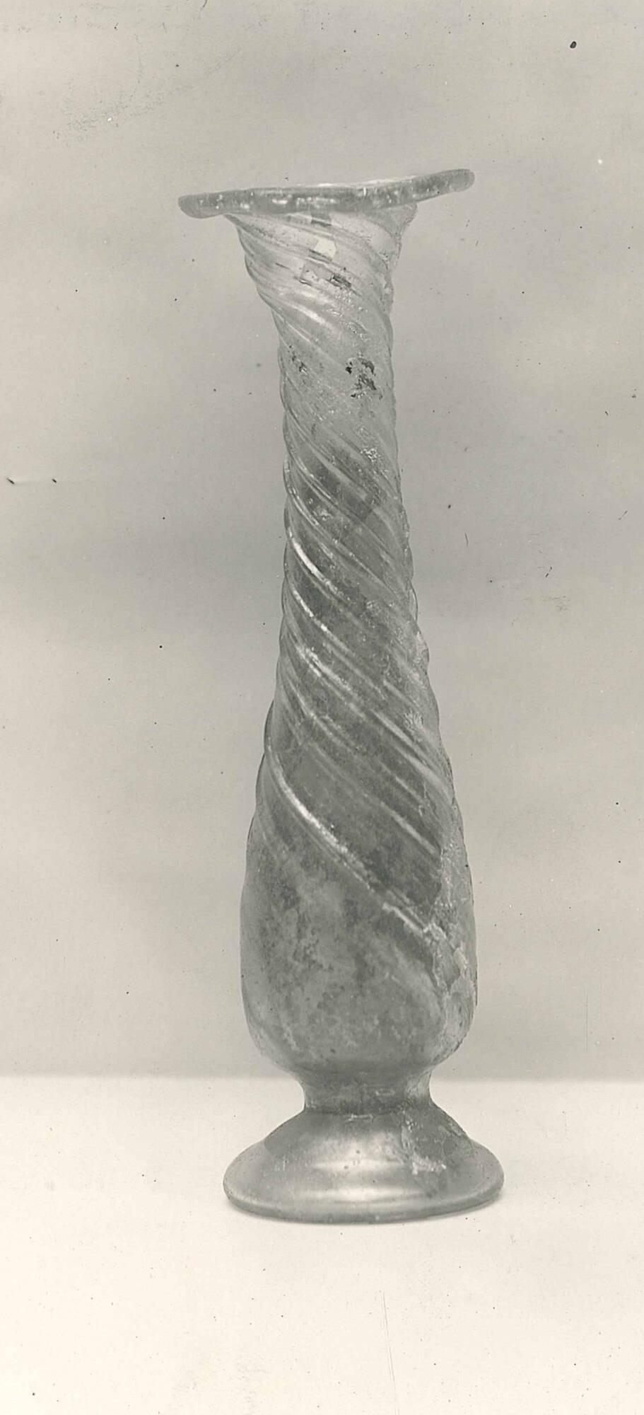 This slender, mold-blown jar features spiraling ribs that wrap around its surface. The bulging base and traces of two missing handles suggest it was both decorative and functional. Its shape and decoration were formed by blowing glass into a patterned mold and then twisting it.