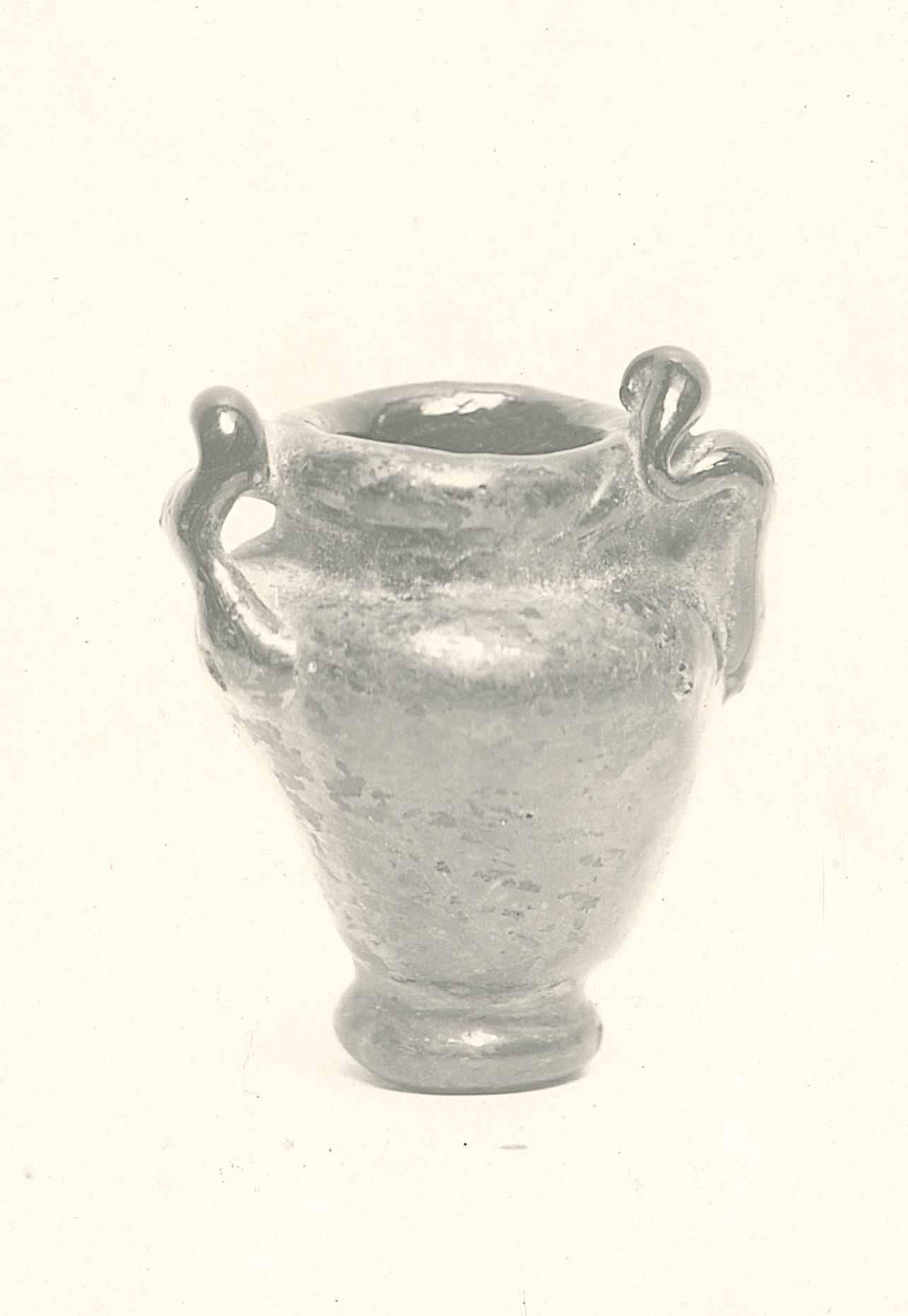 Rim rounded in flame. Crimped neck. Gently sloping shoulder. Inverted conical body. Small non-functional disk-shaped knob at base. Vessel cannot stand. Two curved coil handles applied to side of shoulder and attached to side of rim where they are folded upward and pinched to form vertical projections.