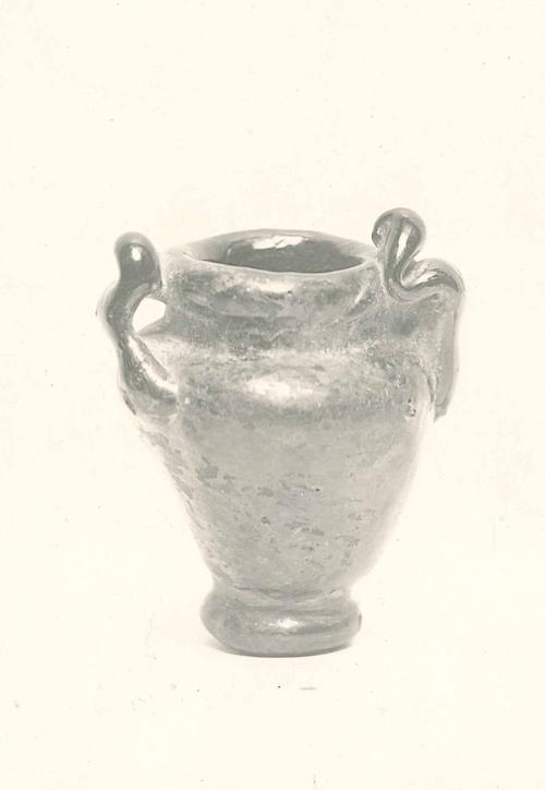 Rod-tooled. Excess glass at tips of handles snapped off and melted into surfaces. Very thick glass. Several medium and one large bubble burst at surface. Oval bubbles in horizontal direction but slanting slightly from top left to lower right.