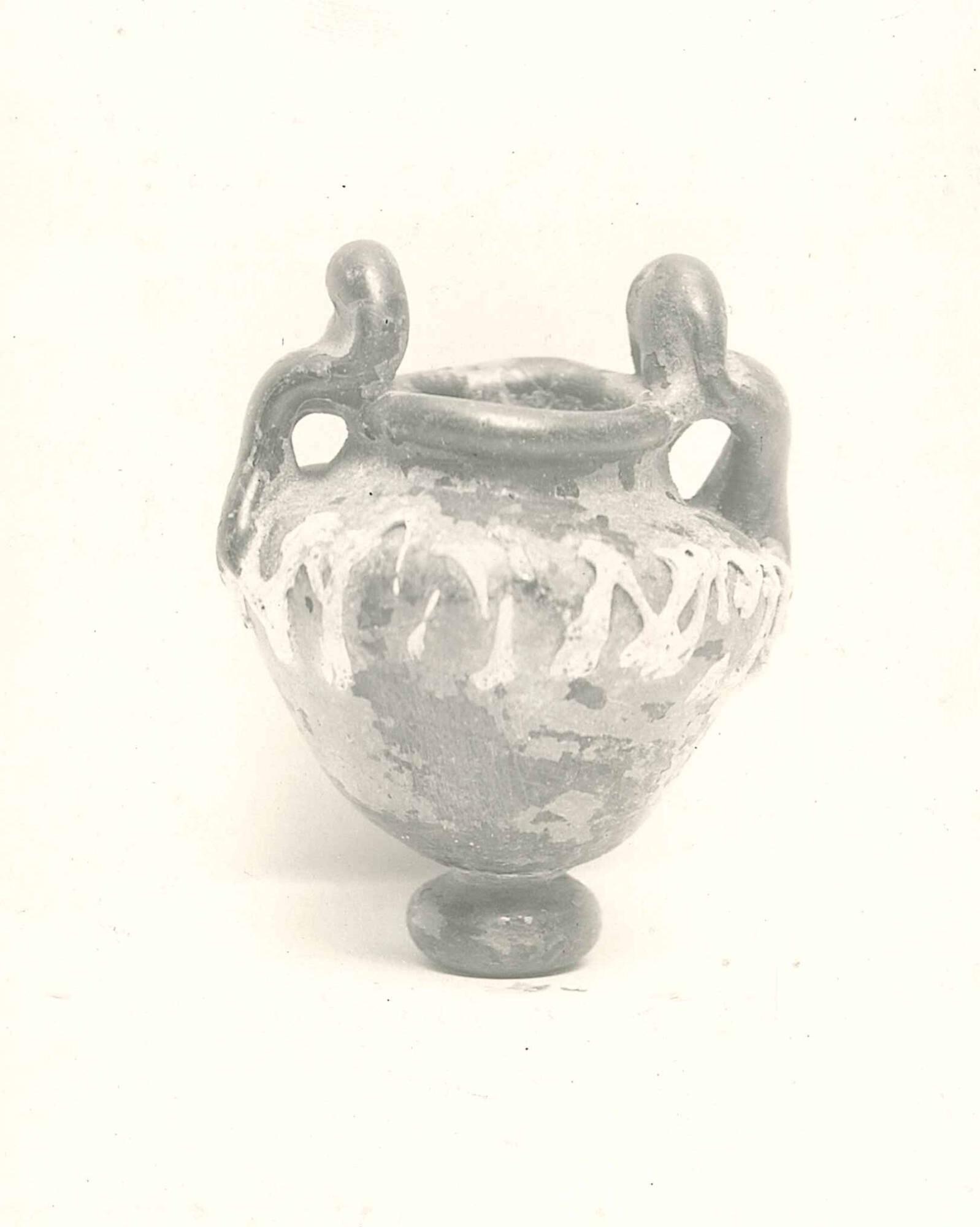 Rod-tooled. Added thread. Excess glass at tips of handles melted into surface. Very thick glass.